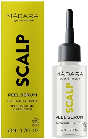 Serum MADARA do peelingu skóry głowy, wzbogacone kwasami mlekowym i hialuronowym, głęboko złuszcza i zapewnia skuteczne oczyszczenie skóry głowy, usuwając martwe komórki naskórka, nagromadzone produkty, nadmiar olejów i brud.