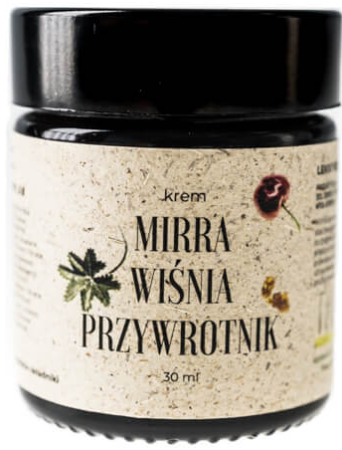 Krem mirra wiśnia przywrotnik o lekkiej konsystencji. Idealny dla skóry mieszanej, dojrzałej i naczynkowej. Opóźnia procesy starzenia skóry. Dodaje słonecznego blasku. Wygładza, chroni przed czynnikami zewnętrznymi. Zawiera kolagen roślinny i koktajl antyoksydantów.