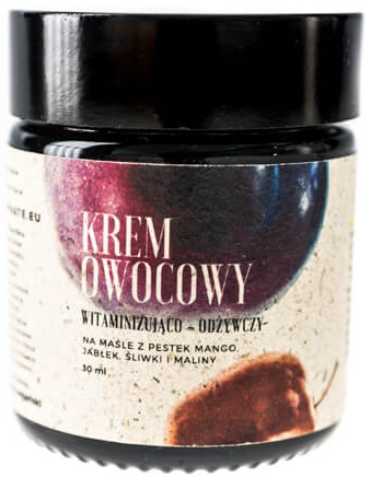 Naturalny krem owocowy na dzień i na noc. Pełnotłusty krem dla skóry suchej, zmęczonej i dojrzałej. Poprawia jędrność i gęstość skóry, idealnie nawilża. Mocno witaminizuje i odżywia. Idealny na mrozy, wiatr i słońce. Chroni skórę przed wysuszaniem, czynnikami zewnętrznymi i zanieczyszczeniami. Pomaga opóźnić procesy starzenia.