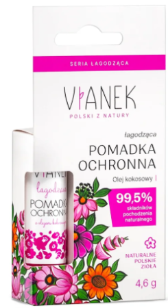 Pomadka ochronna o działaniu łagodzącym na bazie roślinnych olejów (słonecznikowy, jojoba, sojowy, kokosowy) oraz maseł (kakaowe, shea). Nawilża i chroni usta przed szkodliwymi czynnikami zewnętrznymi. Apetyczny smak i zapach (bananowy) sprawia, że będzie chętnie stosowana przez dorosłych i dzieci.